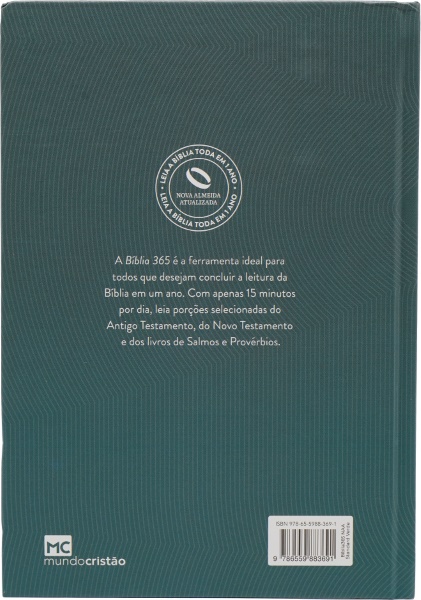 A Bíblia 365 é uma Bíblia Sagrada cuidadosamente diagramada com leituras diárias. Para cada dia, há uma porção do Antigo Testamento, do Novo Testamento, de Salmos e de Provérbios. Essas passagens são agrupadas em páginas consecutivas, o que confere frescor e diversidade aos momentos de estudo e reflexão.