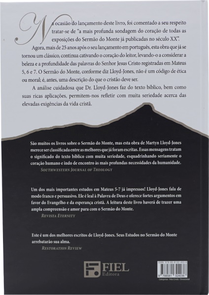 Estudos no Sermão do Monte, Lloyd Jones toca o coração do leitor da mesma forma que um cirurgião cardíaco faz: dramática e precisamente. Sua análise penetrante do texto bíblico e ricas aplicações, permitem-nos refletir com seriedade acerca das elevadas demandas da vida cristã. Na ocasião do lançamento deste livro, foi comentado a seu respeito tratar-se de a mais profunda sondagem do coração de todas as exposições do Sermão do Monte já publicadas no século XX. Agora, mais de 25 anos após o seu lançamento em português, esta obra que já se tornou um clássico, continua cativando o coração do leitor, levando-o a considerar a beleza e a profundidade das palavras do Senhor Jesus Cristo registradas em Mateus 5, 6 e 7. O Sermão do Monte, conforme diz Lloyd Jones, não é um código de ética ou moral; é, antes, uma descrição do que o cristão deve ser.