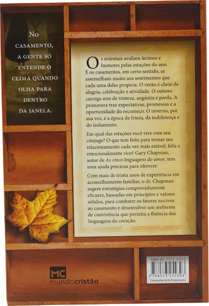 No casamento, a gente só entende o clima quando olha para dentro da janela. Os orientais avaliam ânimos e humores pelas estações do ano. E os casamentos, em certo sentido, se assemelham muito aos sentimentos que cada uma delas propicia. O verão é cheio de alegria, celebração e atividade. O outono carrega ares de tristeza, angústia e perda. A primavera traz expectativas, promessas e a oportunidade do recomeço. O inverno, por sua vez, é a época da frieza, da indiferença e do isolamento. Em qual das estações você vive com seu cônjuge? O que tem feito para tornar seu relacionamento cada vez mais estável, feliz e emocionalmente rico? Gary Chapman, autor de "As cinco linguagens do amor" - um sucesso que gerou várias continuações e presença constante em listas de mais vendidos, dentre as quais a liderança por várias semanas do ranking de livros religiosos da respeitadíssima Publishers Weekly -, tem uma ajuda preciosa para oferecer.