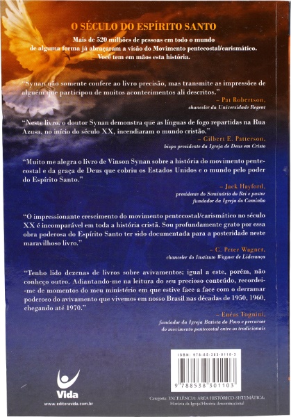 Mais de 520 milhões de pessoas em todo o mundo de alguma forma já abraçaram a visão do Movimento pentecostal e carismático. Você tem em mãos esta história. O século do Espírito Santo apresenta as raízes do movimento realizado pelo Espírito Santo ao longo do século XX. Vinson Synan, renomado historiador pentecostal-carismático, compilou a história de modo atraente tanto para os de dentro quanto para os de fora do movimento. Paralelamente à narrativa histórica, destacam-se as principais personalidades e sua relação com o movimento. Capítulos separados analisam o papel das mulheres, a participação dos afro-americanos e latinos, os ministérios de cura, o televangelismo e muito mais. Cada capítulo foi escrito por uma autoridade no assunto.