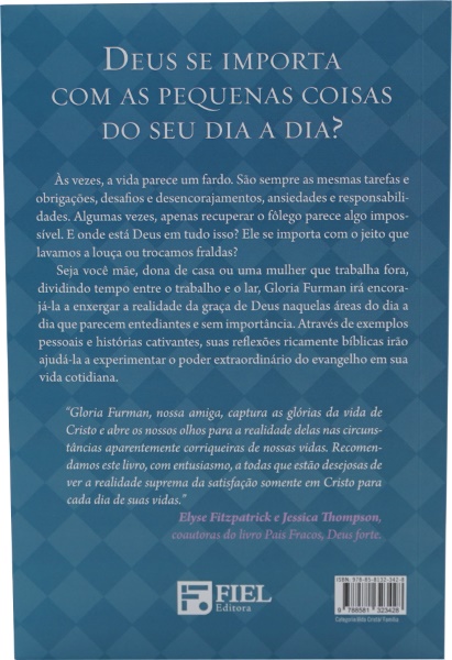 Às vezes, a vida parece um fardo. São sempre as mesmas tarefas e obrigações, desafios e desencorajamentos, ansiedades e responsabilidades. Todas as mulheres já experimentaram essa sensação, seja uma mãe, dona de casa ou uma mulher que trabalha fora, dividindo tempo entre o trabalho e o lar. Porém, este livro irá encorajar suas leitoras a enxergar a realidade da graça de Deus naquelas áreas do dia a dia que parecem entediantes e sem importância. Através de exemplos pessoais e histórias cativantes, a autora apresenta reflexões ricamente bíblicas que irão ajudar a leitora a experimentar o poder extraordinário do evangelho em sua vida cotidiana.